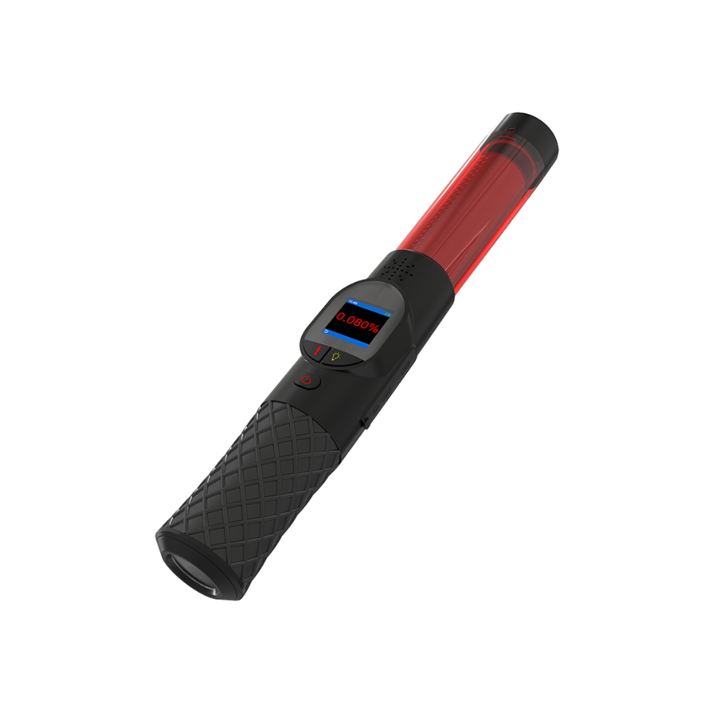- Keturi valdymo mygtukai – atskiras žibintuvėlio, šviesos lazdelės, alkoholio testavimo ir užrakto valdymas.